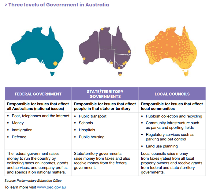 In Australia, responsibilities are shared across three levels of government – federal, state and local. Each plays a distinct role in delivering services and managing resources that affect our daily lives.