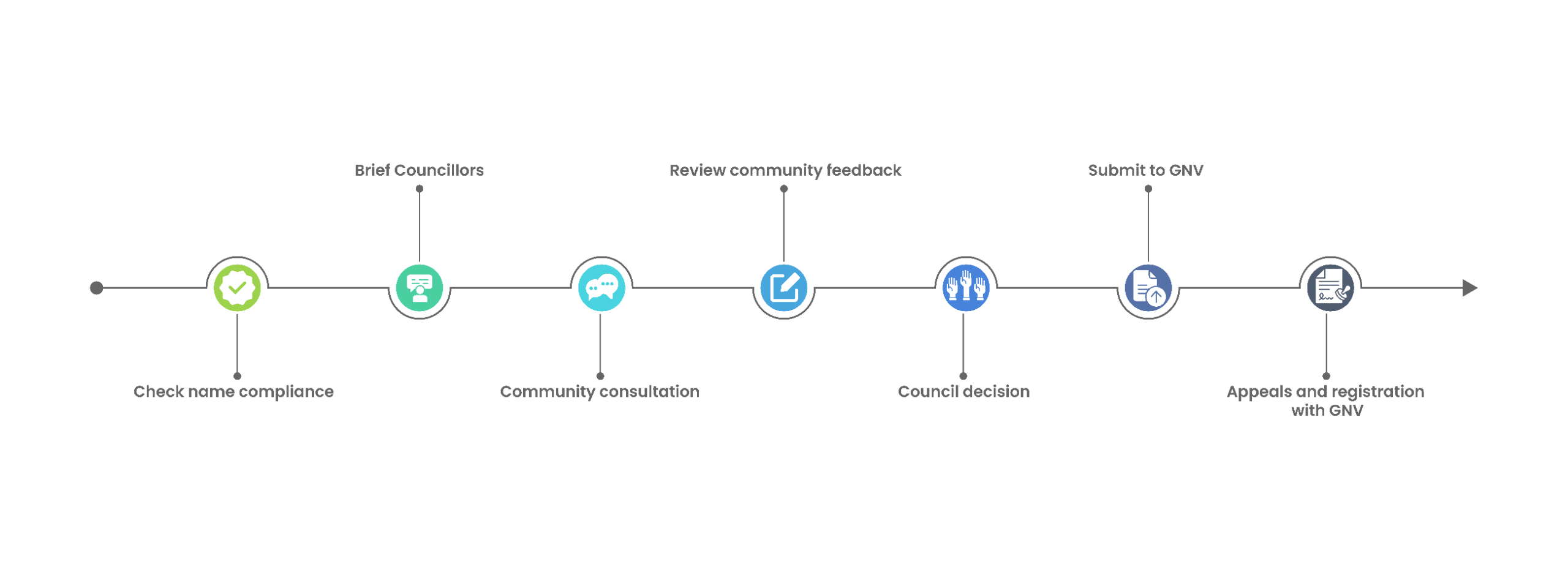 All naming decisions must comply with the State Governments Naming Rules for Places in Victoria (2022 Edition), which are established under the Geographic Place Names Act 1998. These rules help ensure that names are unique, appropriate and, reflect the historical and cultural significance of the area.
